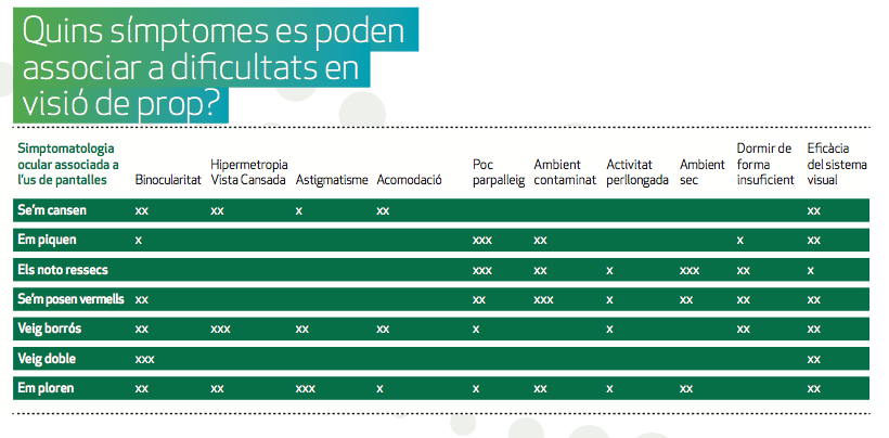 Una falta de correcció, per petita que sigui, sobretot en hipermetropies, astigmatismes o vista cansada i fins i tot en persones amb bones agudeses visuals de lluny, pot induir símptomes indesitjables amb l'ús de pantalles.